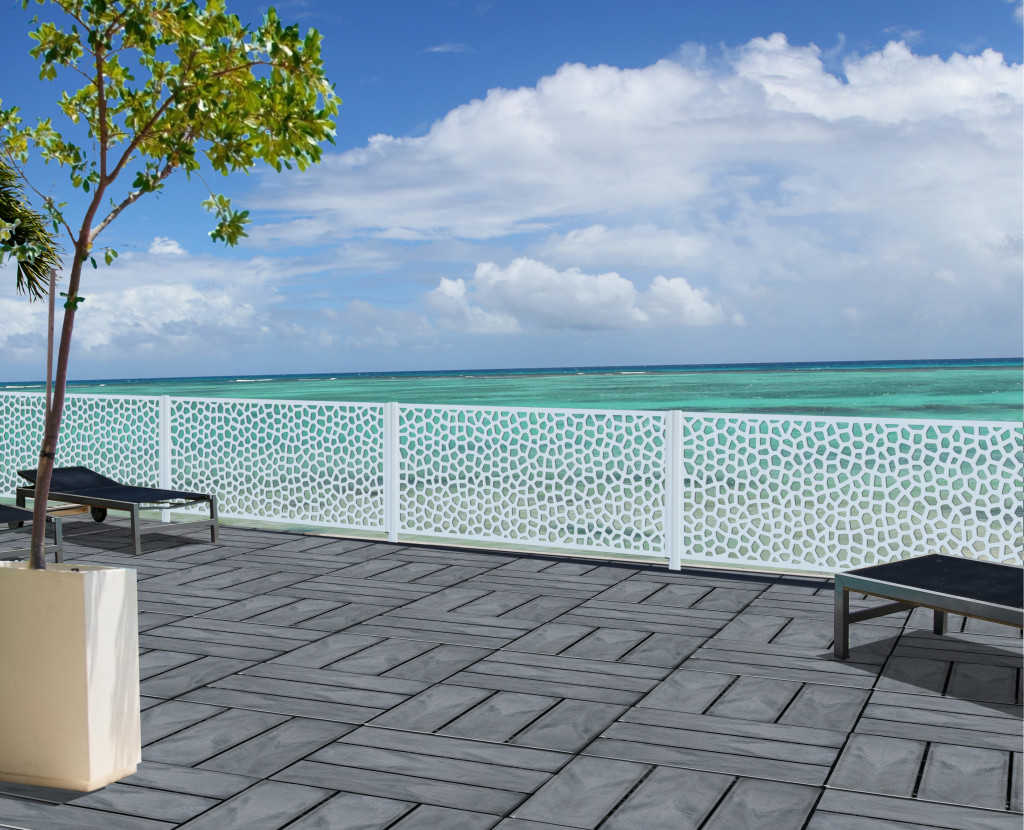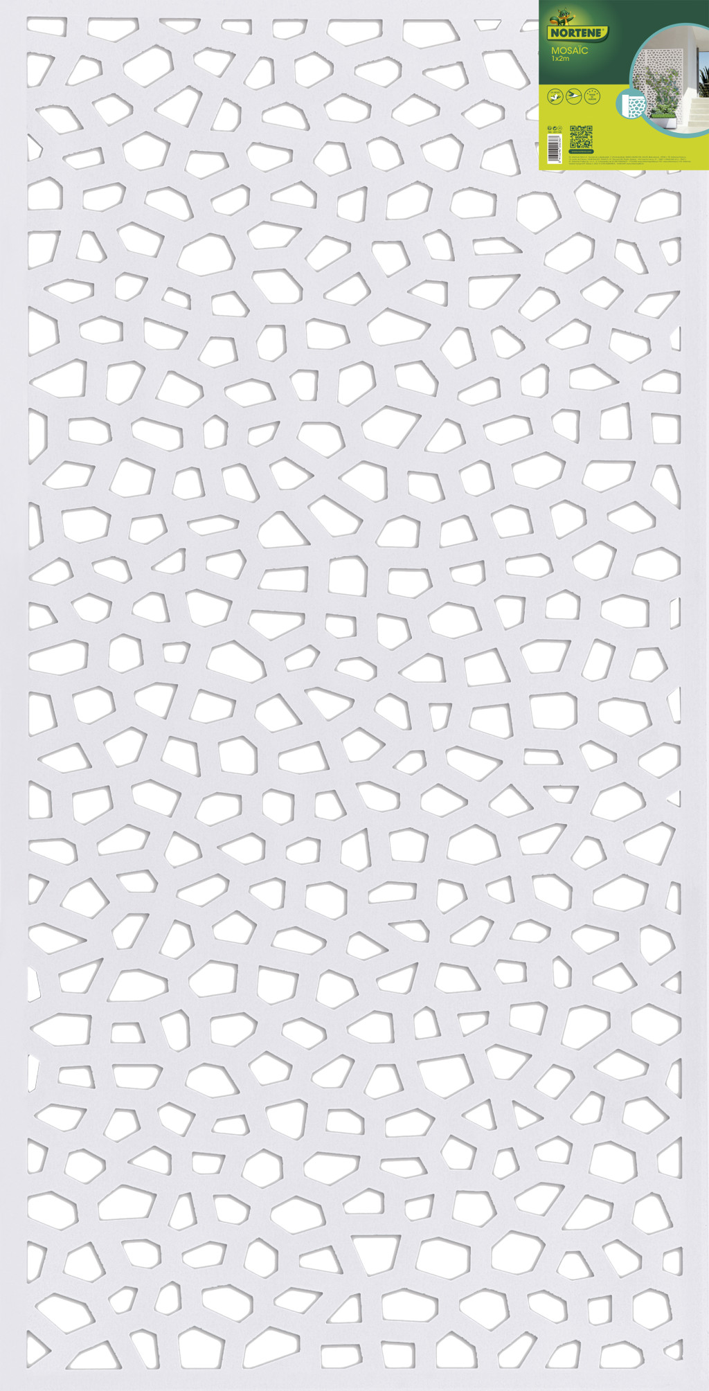 Mozaik mintás, modern megjelenésű PP panel, mely alkalmazható térelválasztóként vagy futtatóként is. Időjárásálló, fémes hatású, diszkréten illeszkedik mind a kültéri, mind a beltéri dekorációkhoz.