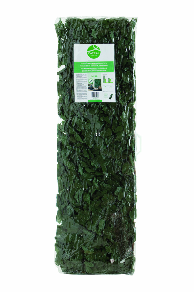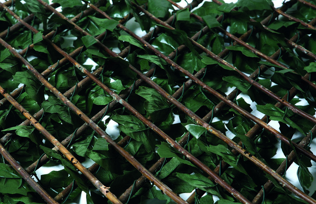 Fűzfából készült harmonikaszerűen nyitható apácarács zöld levelekkel. Falak vagy erkélyek azonnali takarására. Tetszőlegesen alakítható.