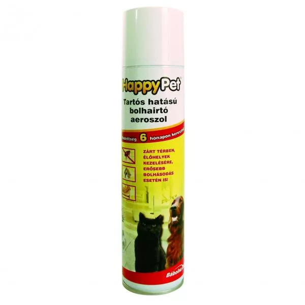 A Happy Pet tartós hatású bolhairtó aeroszol a házi kedvencek élőhelyének kezelésére szolgáló készítmény. Erősebb bolhásodás esetén is alkalmazható, és akár 6 hónapon keresztül védelmet biztosít a környezetben megjelenő bolhákkal szemben.