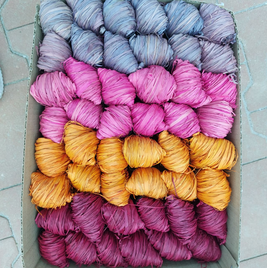 Madagaszkári raffia kötöző natúr, rózsaszín, narancssárga, levendula és bordó színekben, amely felhasználható ültetéshez, dekorációhoz.